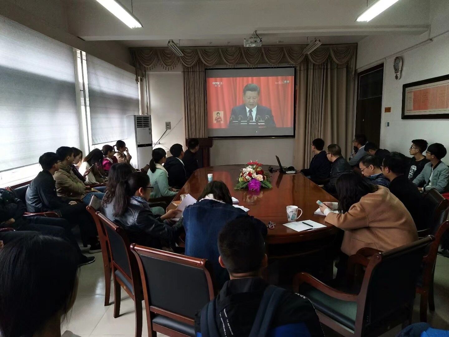 2017年10月18日,m88官网党总支组织全体员工党员、团干跟随老师在九号楼m88官网会议室观看中国共产党第十九次全国代表大会开幕会盛况。